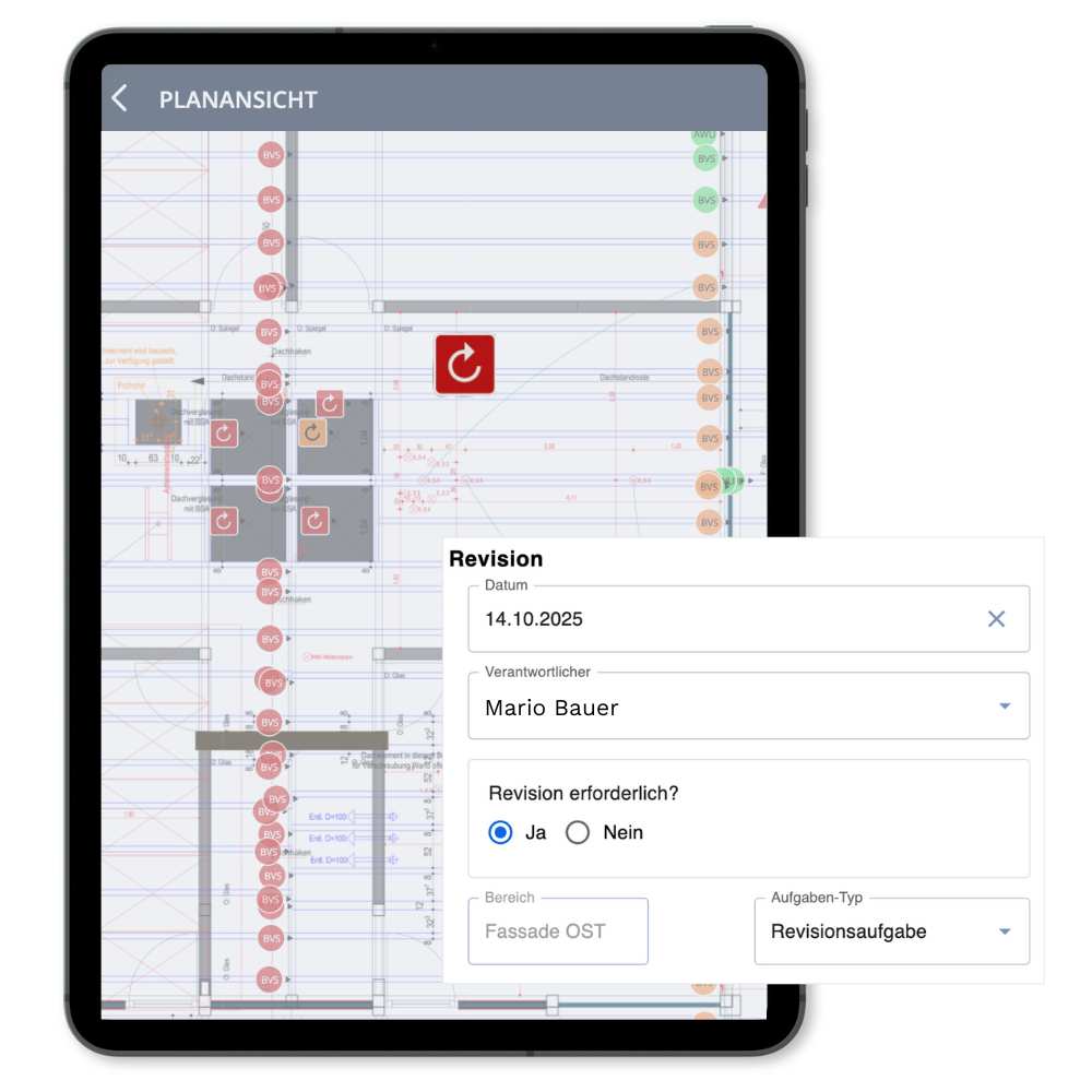 Besonders wertvoll für Dachdeckerbetriebe ist die klare Aufgabenverteilung und die gesamte Baudokumentation u.a. mit Fotos: Wer hat welche Fläche gedeckt, wo fehlen noch Firststeine, welche Mängel wurden entdeckt, was wurde zusätzlich erledigt? Alles direkt im Plan markiert, mit Kommentaren und Status, sofort sichtbar im Büro. Auch Nachträge lassen sich dokumentieren und rechtssicher begründen. Ein echter Vorteil in der Abrechnung.